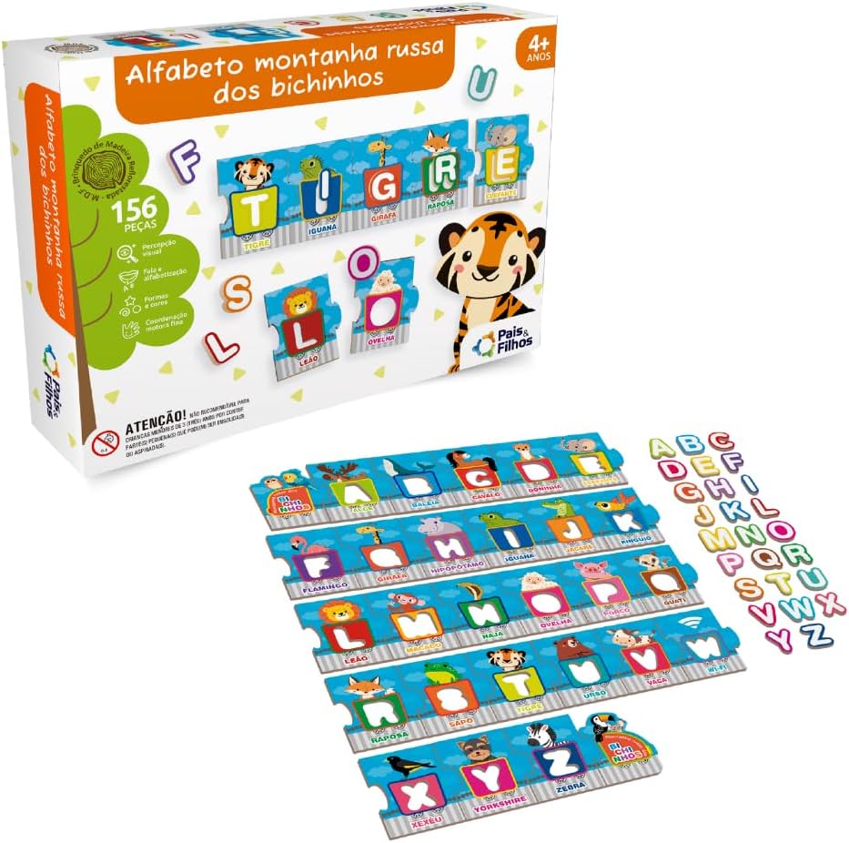 Este alfabeto é composto por placas com as letras e imagens temáticas de animais que representam cada letra, proporcionando uma experiência completa para o aprendizado. O jogo estimula o raciocínio e ajuda na alfabetização básica das crianças.