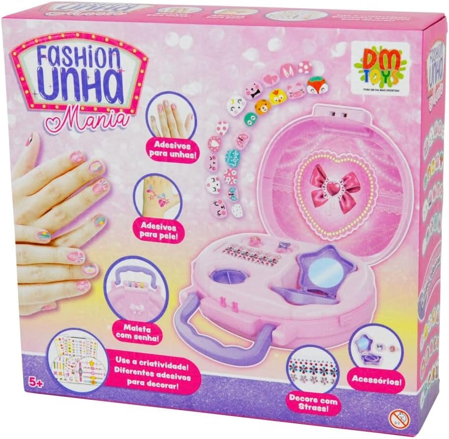 As principais peças incluem adesivos com diversas cores e formatos divertidos, além de anéis e pulseiras infantis que complementam o visual. A maleta em plástico durável tem divisórias para organizar todos os itens, mantendo-os protegidos e prontos para uso.