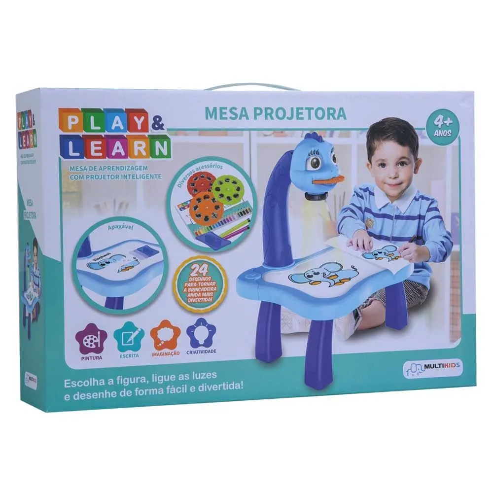 O produto possui estrutura em plástico azul com quatro pernas fixas e um projetor em formato divertido de animal. A mesa tem área para desenhar e apagar, auxiliando o aprendizado e o desenvolvimento de habilidades artísticas e cognitivas das crianças.